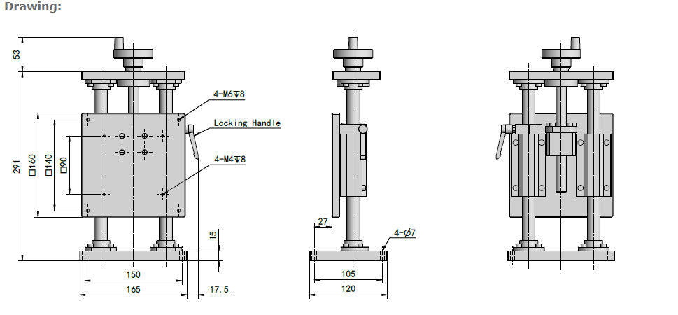 The manual long-travel vertical stage uses a Trapezium Lead Screw & Linear Bearing, which ensures fast and smooth motion. This long-travel vertical translation stage features a big platform and a long travel range. The trapezoidal lead screw, with 4mm pitch, ensures fast motion by hand-wheel drive.