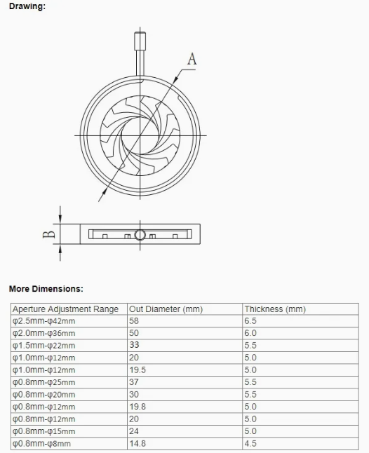 The Unmounted High-Power Adjustable Iris Diaphragms are feasible with continuously adjustable clear aperture.